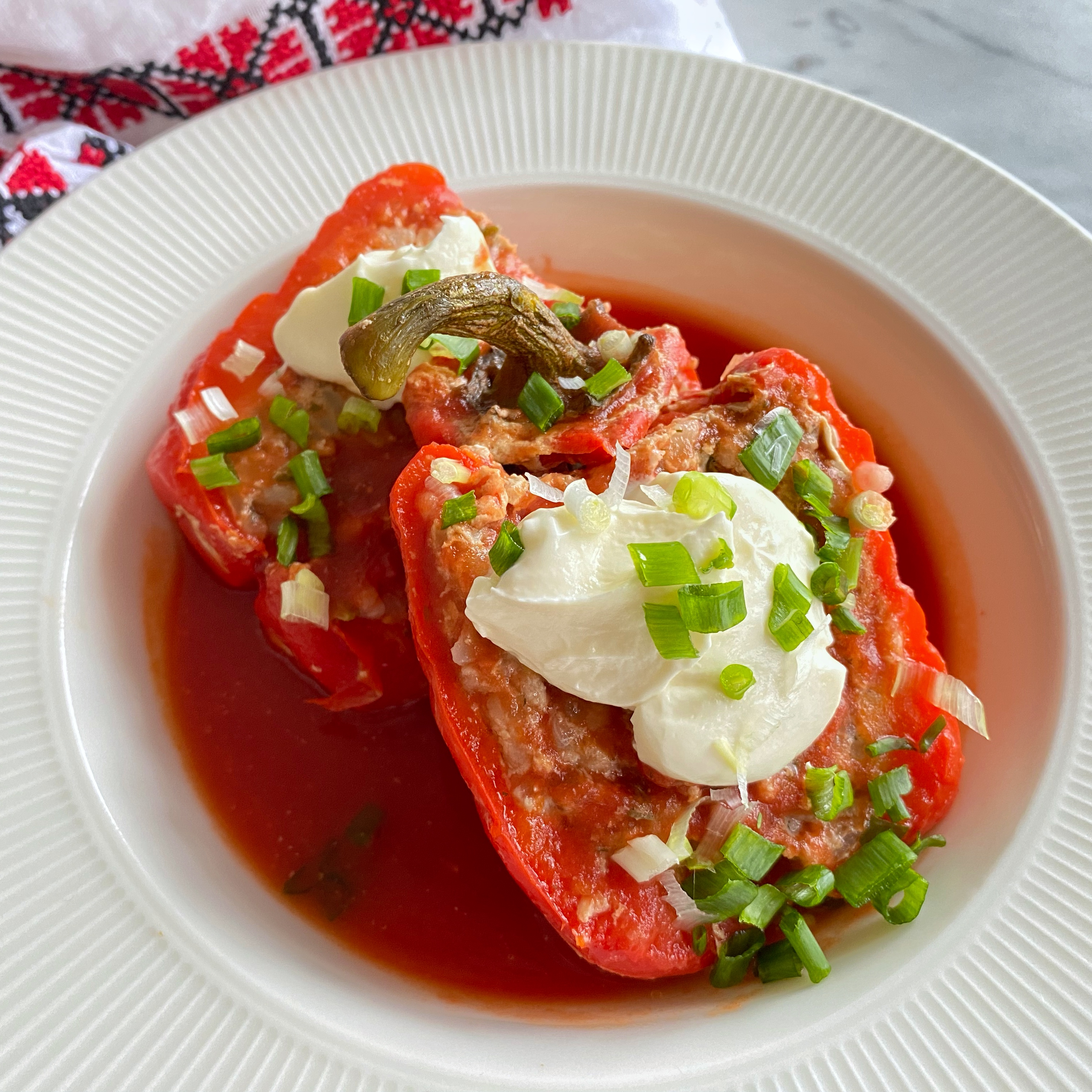 Our stuffed bell peppers are reminiscent of our Romanian origins. The stuffing is soft and perfectly balanced: minced Spanish pork, rice, onions and herbs come together as a whole, well complimented by a smooth tomato sauce. And you can add our much acclaimed homemade wholewheat sourdough bread to your order. This dish contains eggs.